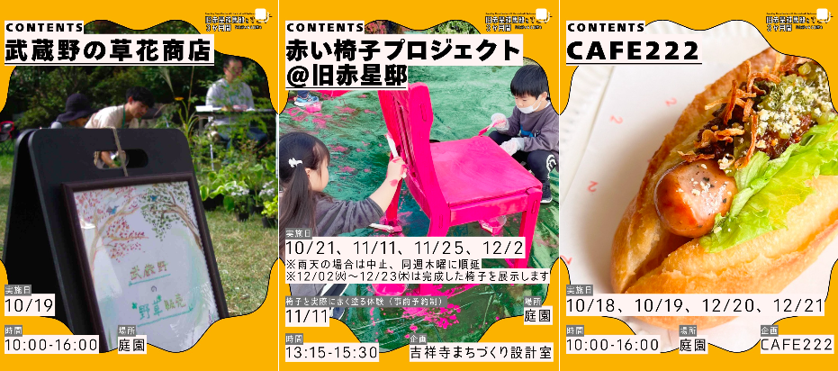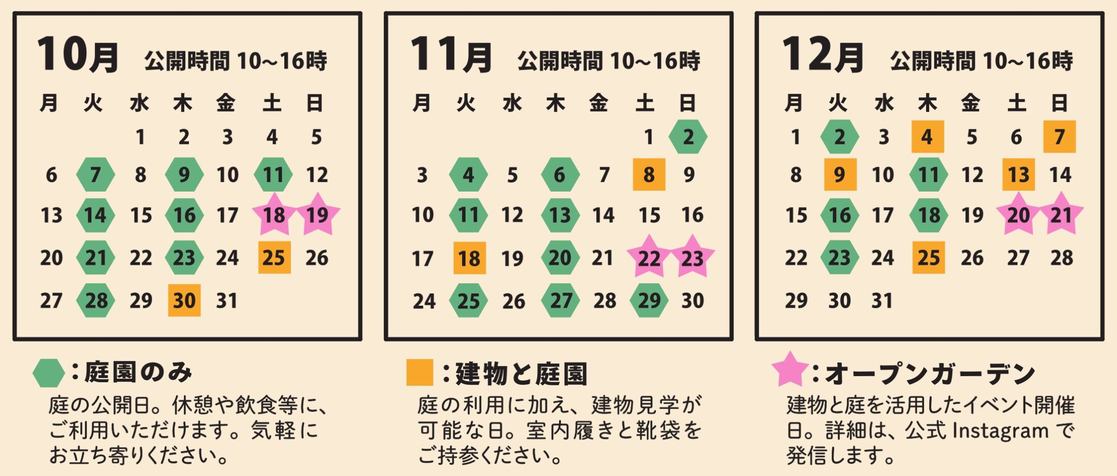 武蔵野市では、10月〜12月の3か月間、この文化財の建物と庭園を一般公開しています。月2回のオープンガーデンの日には、ワークショップやイベントも開催されます。