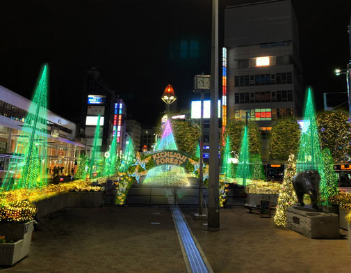 北口駅前広場のイルミネーションは、“KICHIJOJI FOREST”として、駅前に森が現れるイメージでデザインされ、広場中央には高さ6mの円錐型でカラフルに色が変わるツリーを配置します。