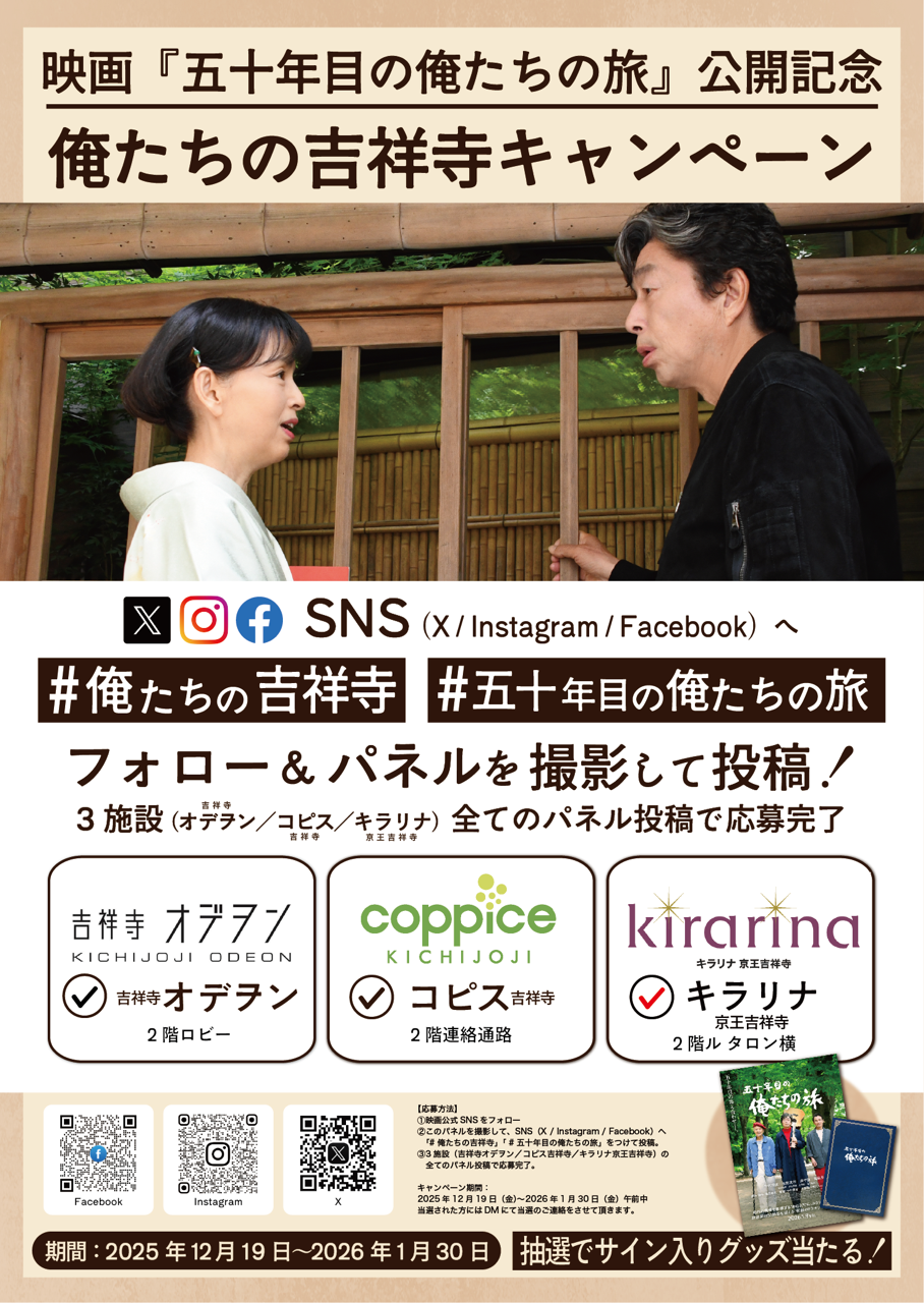 映画公式SNSをフォローの上、キラリナ吉祥寺、吉祥寺オデヲン、コピス吉祥寺の3施設すべてのパネルを撮影し、ハッシュタグ「#俺たちの吉祥寺」「#五十年目の俺たちの旅」をつけて投稿で応募完了。