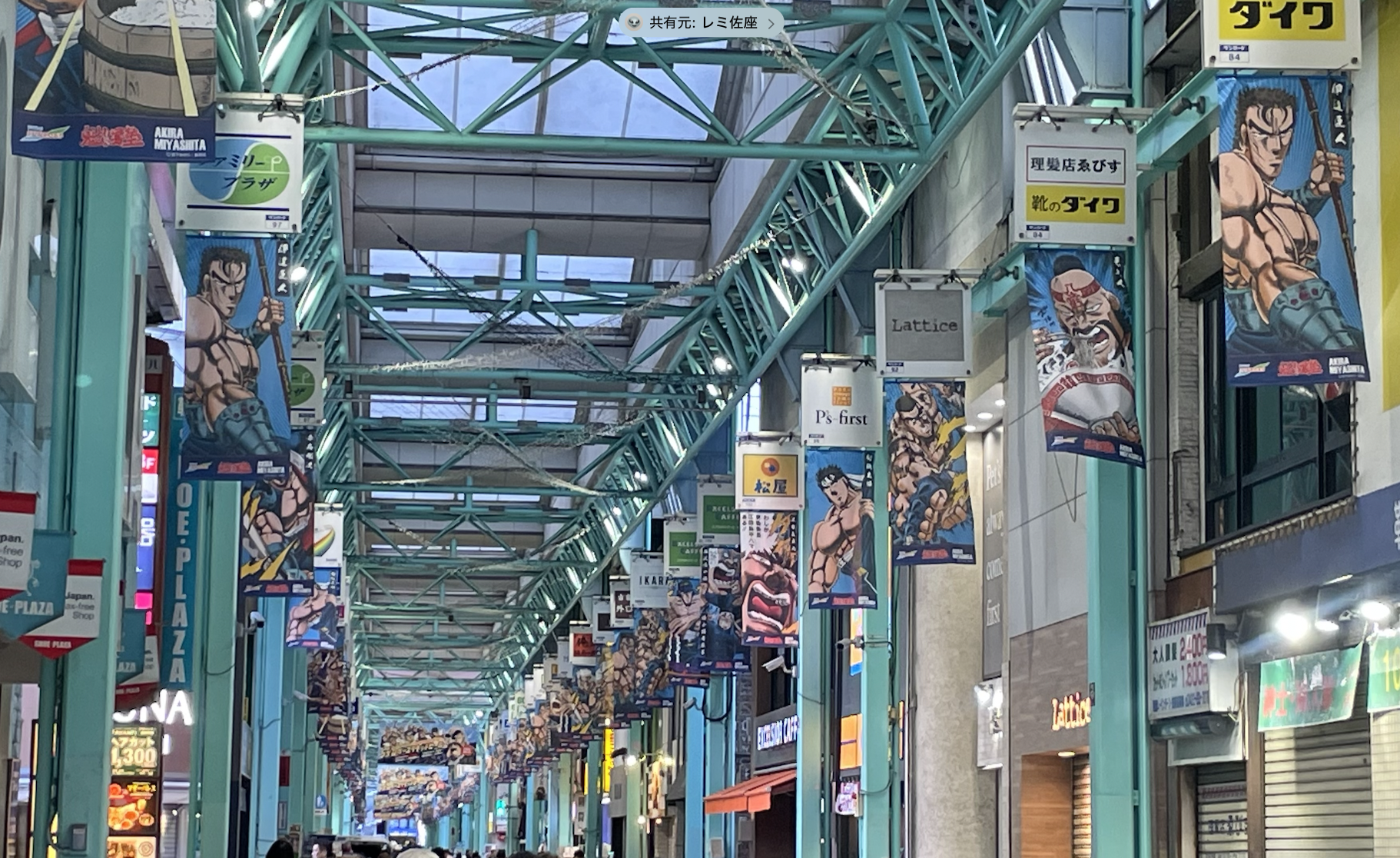 アーケード内にもフラッグが掲げられ、サンロードはスペシャルな宮下あきらワールド一色!