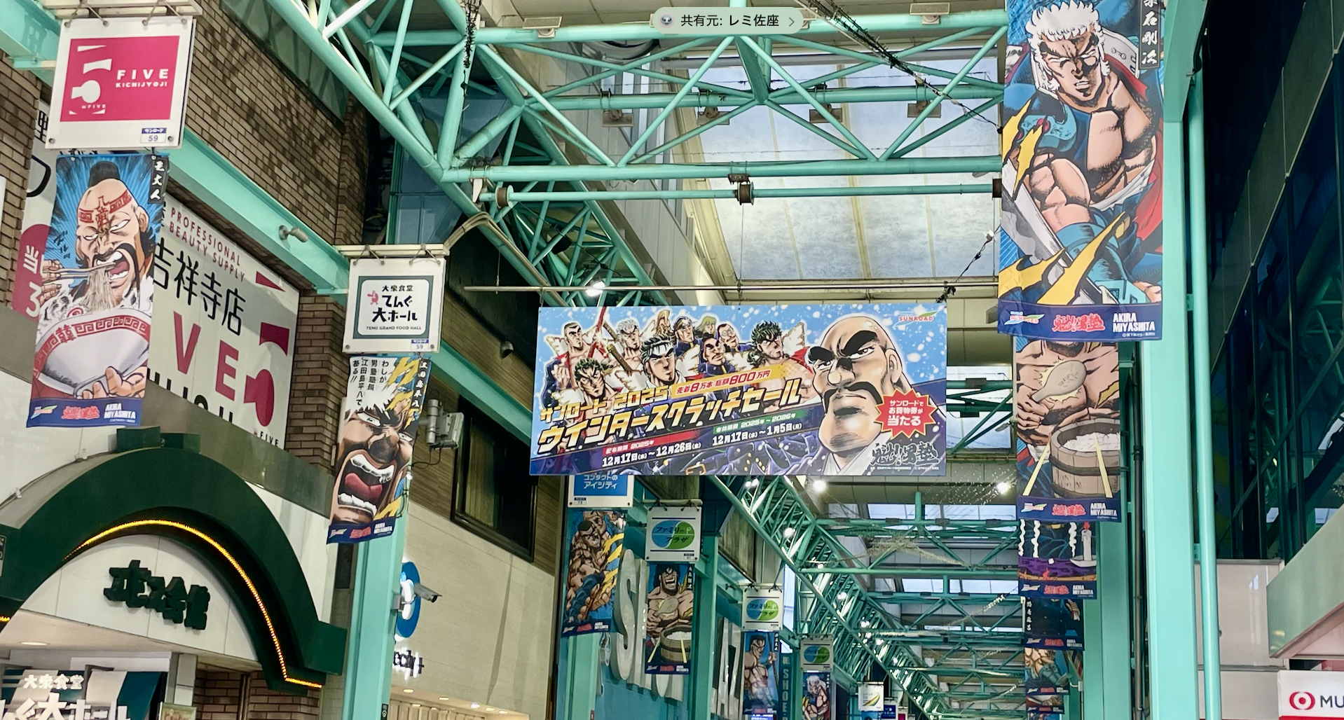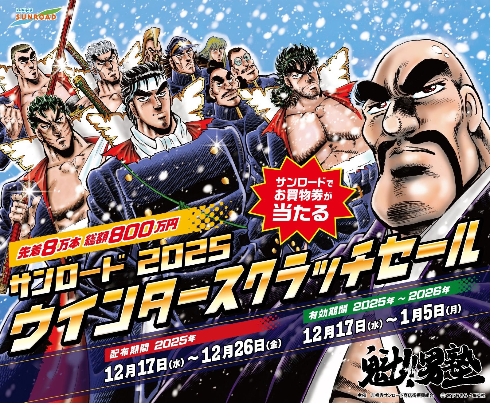 冬恒例の「サンロード2025ウインタースクラッチセール」のメインビジュアルを、夏に続いて宮下あきら先生がご担当され、サンロード商店街の両入口(吉祥寺駅側、五日市街道側)は『魁!!男塾』のキャラクターが大集合した看板が登場しています。