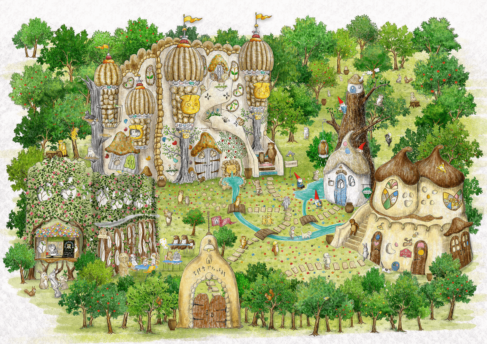 中道通りの吉祥寺プティット村は、絵本の世界をモチーフにした、さまざまなお店が集まったテーマパークのような複合施設です。おとぎ話の入口のような扉を開けるとそこには、“小人たちがひっそりと暮らす小屋に、ねこたちがつくったヘンテコなお城“が。